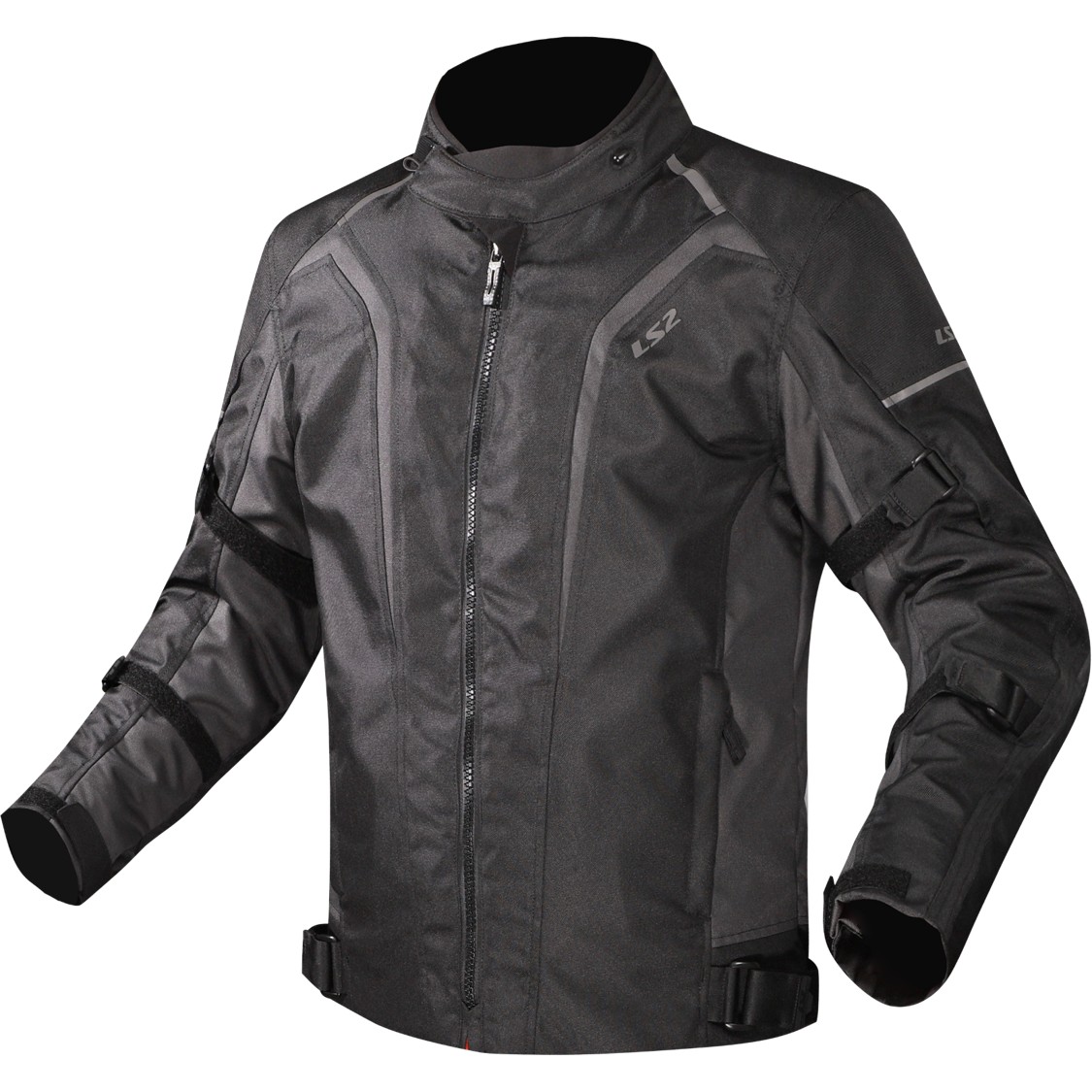 Waterproof touring jacket with removable lining. Cuff, arm, and waist velcro adjustments for comfortable fit. Removable shoulder and elbow protections.